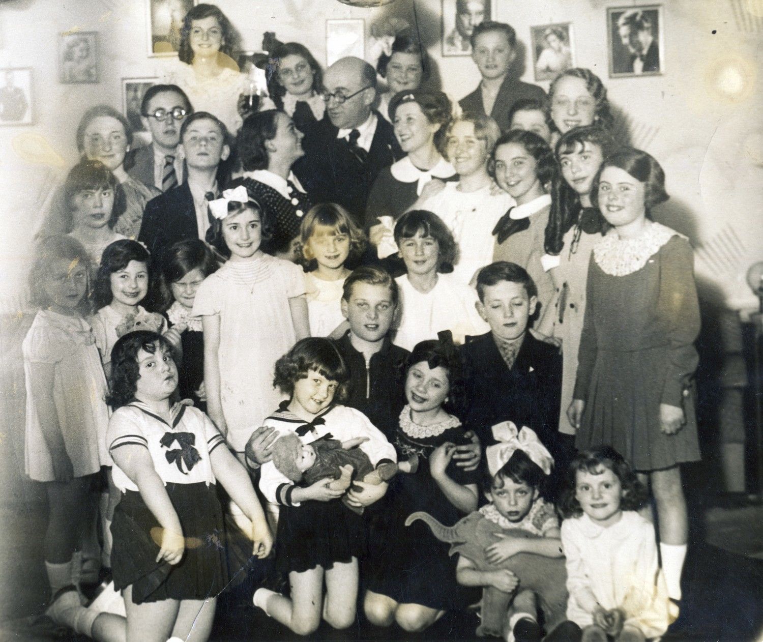 Lakner Bácsi Gyermekszínháza. Lakner Artúr színidirektor a gyermekszínészek között, az első sorban balról a második Pécsi Gizi, a harmadik Ruttkai Éva, őket Puskás Tibor öleli át (fotó: Fortepan)