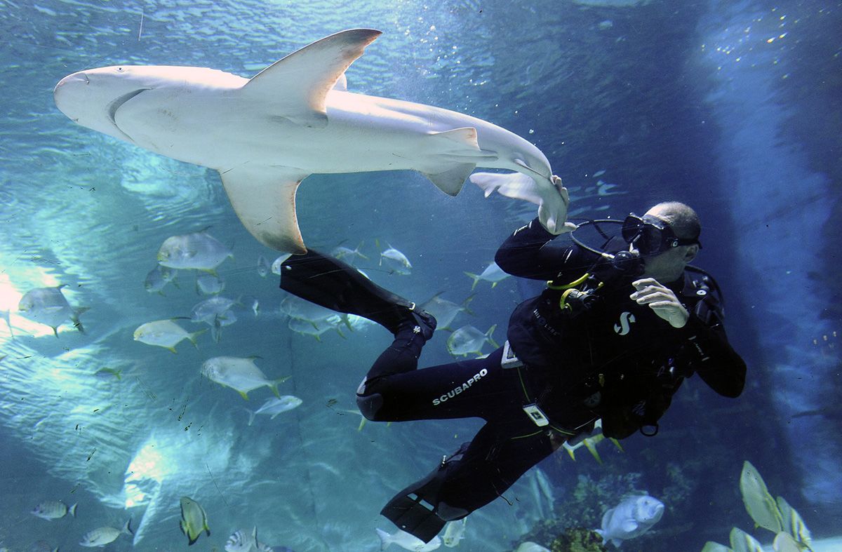 Szabolcs Valentin, a Tropicarium munkatársa és a szirticápa (MTI-fotó: Czimbal Gyula)