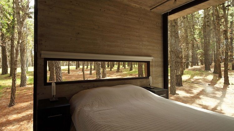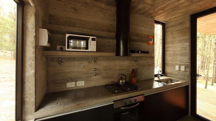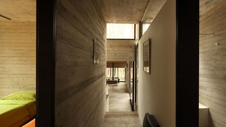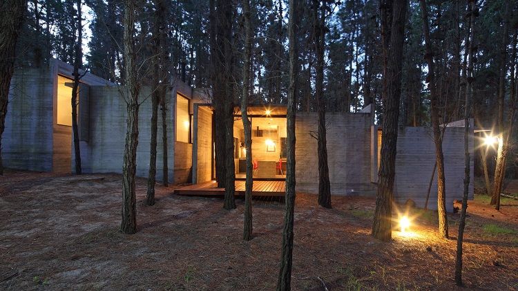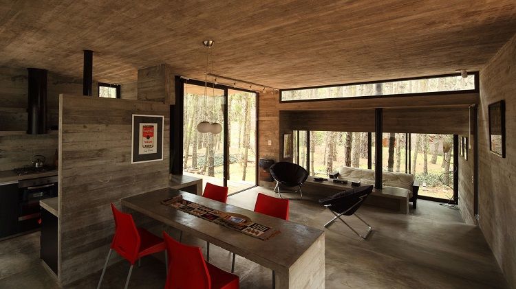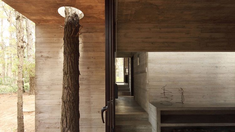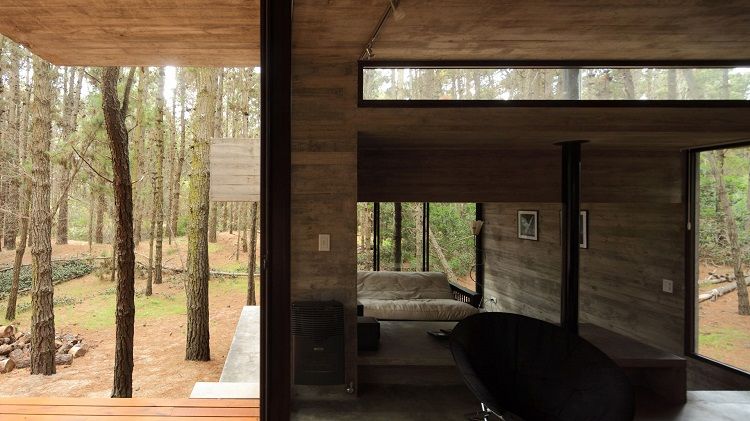 A betonból és fából készült környezetbarát épület szinte beleolvad az erdőbe, hatalmas ablakai természetes fénnyel töltik meg a nyitott tereket. A ház bármely részén tartózkodunk, olyan, mintha kinn lennénk a természetben. A tulajdonosok ökotudatosságát bizonyítja, hogy a ház építésekor az „útban lévő” fákat nem kivágták, hanem otthonuk részévé tették. A berendezés is az egyszerűséget, már-már a minimalizmus határát súrolja, de aki az erdő közepén élhet, azt mindez a legkevésbé sem zavarja.