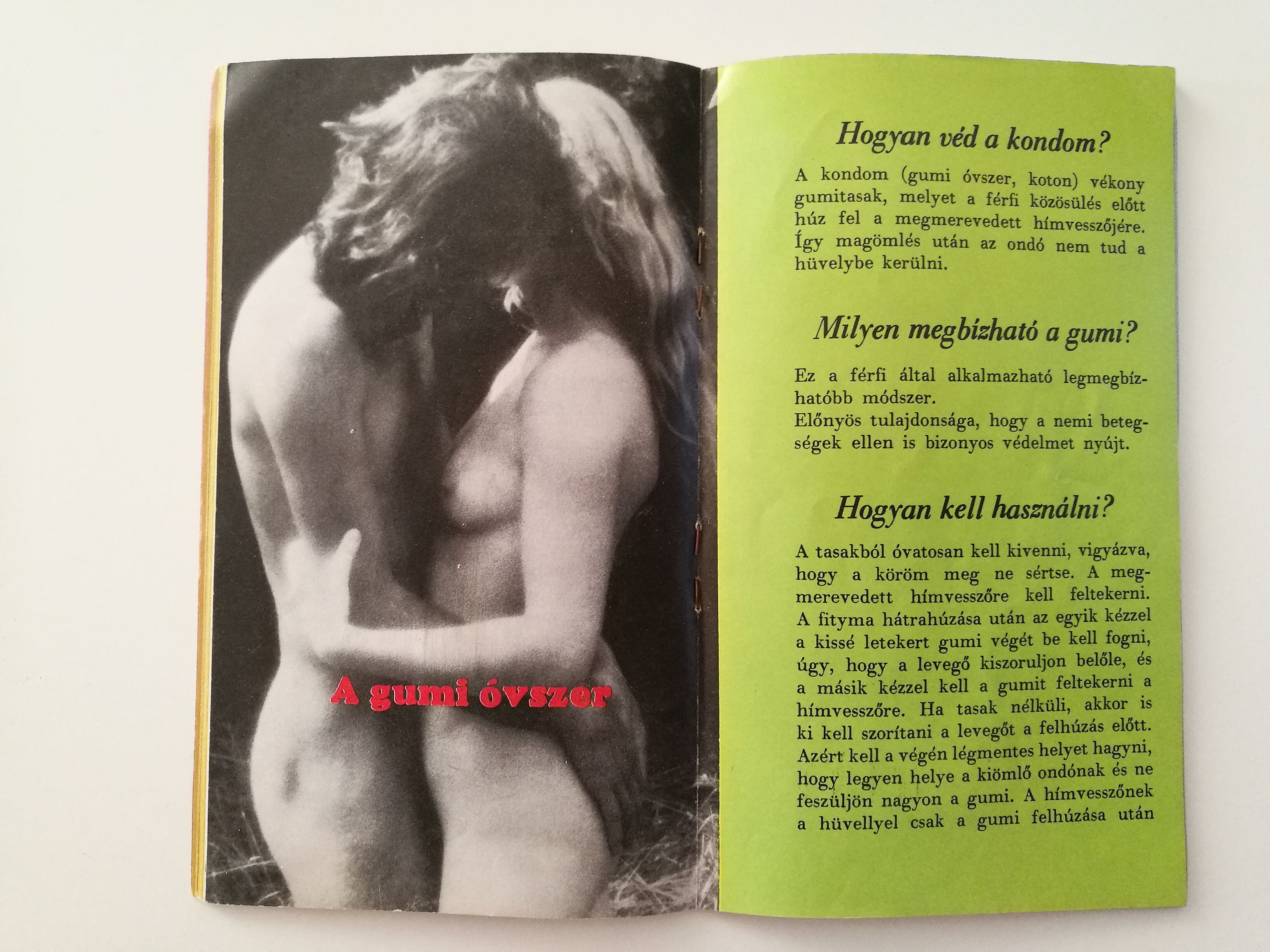 Hogy egy felvilágosító füzetkéből így áradjon az erotika, az mai szemmel elképzelhetetlen. (Pedig az erkölcsök elvileg ugye csak lazultak 1981 óta). Csak egy példa: így néz ki a gumi óvszerről szóló fejezet első két oldala. A testtartás, a kompozíció és az amatőr hatást keltő fekete-fehér, jellegzetesen lágy és szemcsés film szerencsére messze túlmutat a korabeli stockfotóipar kliséin, úgy, hogy az egész mégsem pornográf. Kedves döntéshozók, így kell a fogamzásgátlást marketingelni!