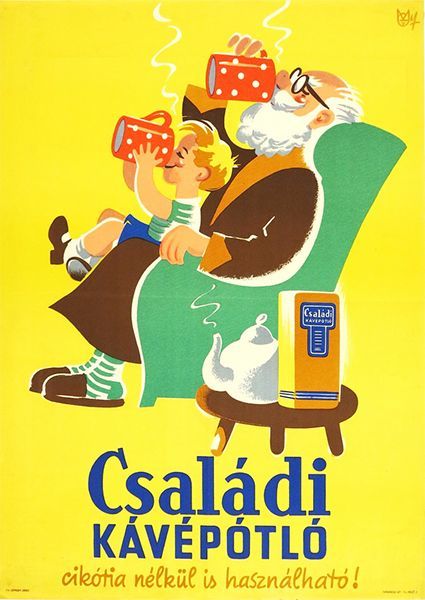 Az Omnia, az Otthon, a Karaván, a Rio és a Mexikó kávék mellett a pótkávék és a cikória kávék is előkelő helyet foglaltak el a közértek eladási listáján. A Maci pótkávé igazi klasszikusnak számít még ma is, nagy elánnal kortyoltuk reggelente a piros pöttyös kis bögrénkből. A kávépótló italokat nemcsak a gyerekek kedvelték, hanem az idősebb korosztály is: nagymama és nagypapa is pótkávéval, vagyis cikóriával indította a napot. A retró plakát is erre a családi idillre utazik: papó és unokája együtt iszogatják a Családi pótkávét, amihez akkoriban ugyan nem fűztek különösebb kommentárt, de ma egészen biztosan hozzátennék, hogy szeretettel készült.