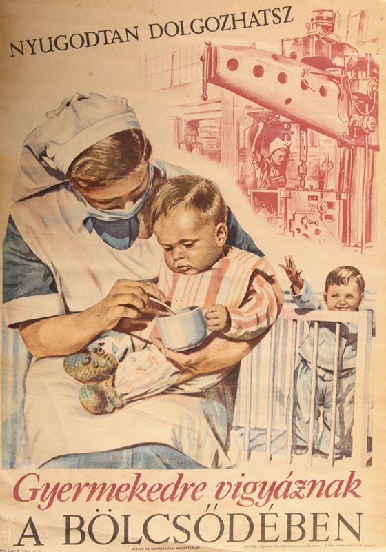 A Kádár-korszakban, ahol a Párt keze mindenhova elért, és a kommunista szellem mindent áthatott – semmi sem állhatott az ötéves és a hároméves tervek útjába. A teljesítéshez azonban kevés volt az elkötelezettség és a jó munkás ember, ha a gyerek otthon sírt, borulhattak a nagyívű célok is. Mivel a dolgozó nő a szocialista eszménykép nélkülözhetetlen eleme volt, és értékes munkaórákkal gazdagította a Magyar Népköztársaságot, a gyerekek felügyeletét az állam magára vállalta. A retró plakát tanúsága szerint amíg az asszonyok a gyártósoron mosolyogva dolgoztak, a bölcsődében gyerekeikre szakértő ápolók vigyáztak.