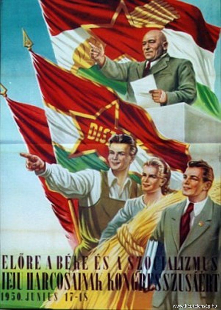 Ha a szocializmusban akadt olyan, aki nem tudta volna az irányt, biztos, hogy volt, aki irányba állította. Ha más nem, egy lelkesítő propagandaplakátról leolvashatta az ember fia, lánya, merre is van az előre. A békét, a szocializmust, a kommunizmust, a dicsőséget és a terv teljesítését egy pillanatra sem hagyták feledésbe merülni azok a retró plakátok, amelyekbe úton-útfélen belebotlottunk. Ilyen volt ez a népnevelő hirdetés is, amelyen a szorgos munkásfiú, az aratás közben megpihenő és ifjú harcos módjára búzát szorongató boldog leány és a mappáival érkező irodista egy irányba néznek – pont oda, ahová a kezéből pisztolyt formáló Rákosi Mátyás és a munkásfiú is mutatnak. Előre!