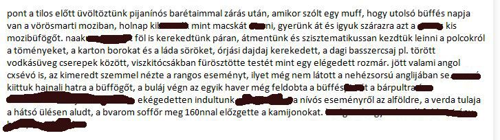 2004-ben senki sem akarta elhinni, hogy bezárnak, pedig már július végén erről beszéltek. Csakhogy így volt ez egy évvel és két évvel előtte is, 2004-ben pedig néztünk bambán, hogy tényleg vége lett. Talán 2003-ban történt, hogy egy ismerősömet borzasztóan zavarta, hogy ott volt Spitzer Gyöngyi (Soma Mamagésa), és a virsli papírtányérján maradt ketchup-mustár egyveleget rákente a ruhájára, egyenesen a fenekére, de a Spitzer nem vette észre, és nem is szólt neki senki