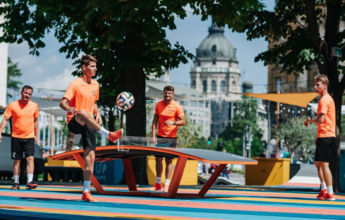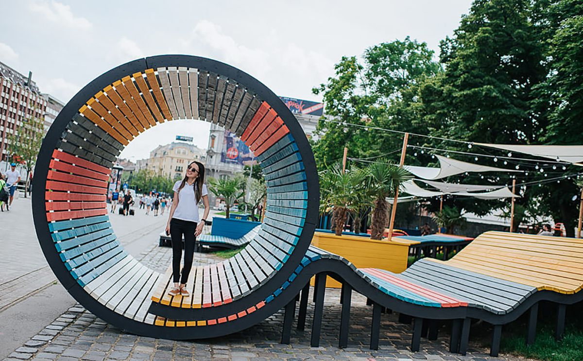 Külön érdekesség, hogy a tervezők egy csomó mókás padot és egyéb ülőalkalmatosságot állítottak fel a téren. Lehet telefont tölteni, sőt egy magyar startup találmányának, a járható napelemeknek köszönhetően energiát is termel a park. Kár, hogy a szezon végén lebontják.