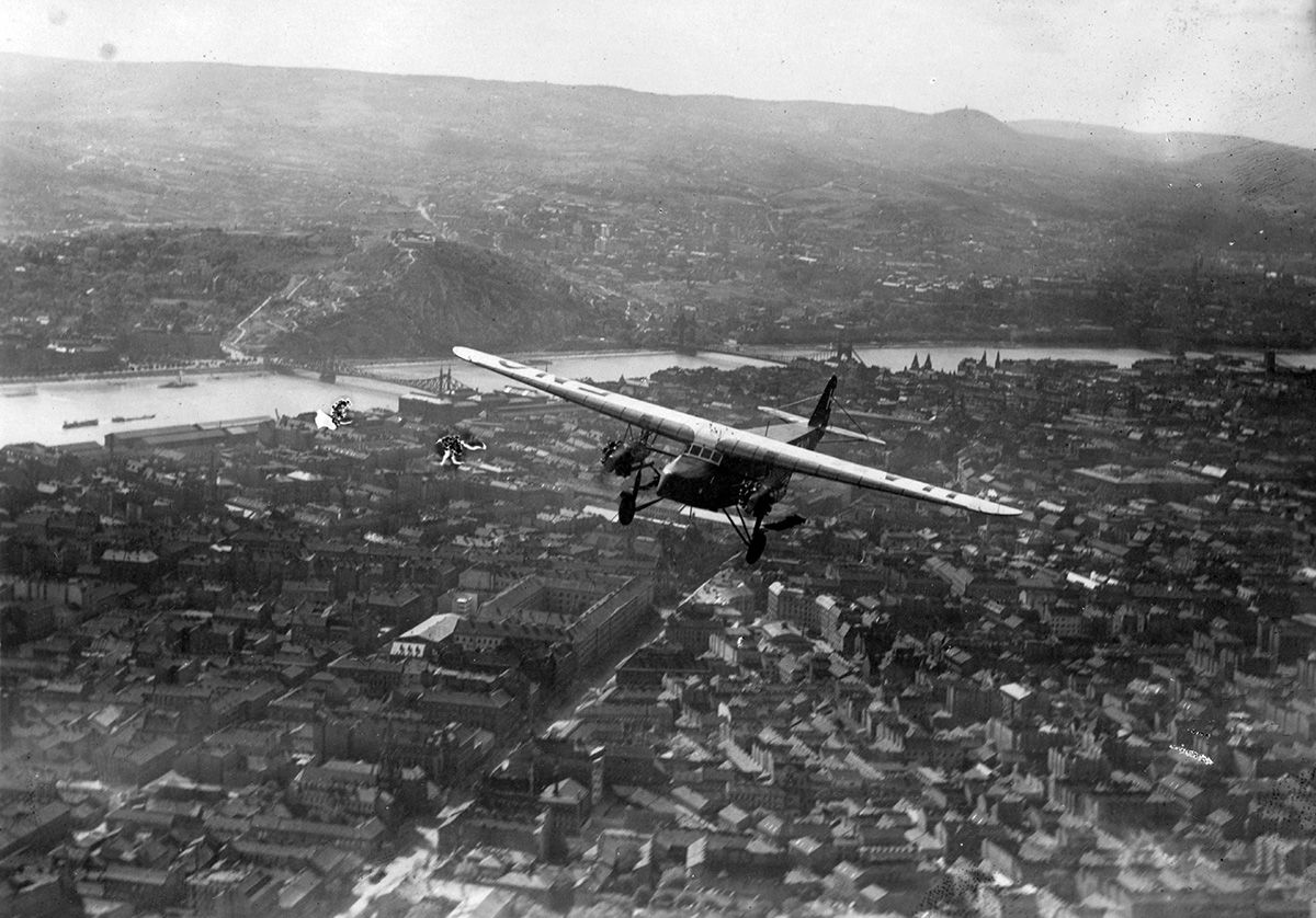 A Fortepan 1935-ös képén egy magyar gyártású Fokker F-VIIIB repül el az Üllői út felett.
