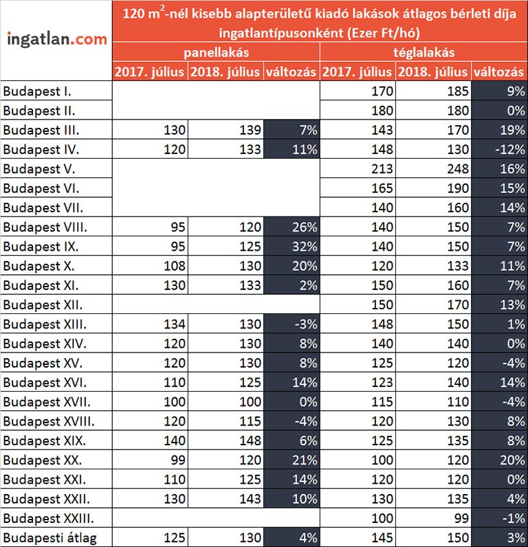 Az árak néhány százalékkal emelkedtek a különböző kerületekben, az országos kínálat is 9 százalékkal bővült. Budapesten az átlagos bérleti díj 150 ezer forint. A fővárosi garzonok 110-120 ezer forintba kerülnek havonta. Pécsen, Debrecenben és Szegeden a kisebb lakásokért 74-85 ezer forintot kell adni, a nagyobbakért 100-106 ezer forintot.