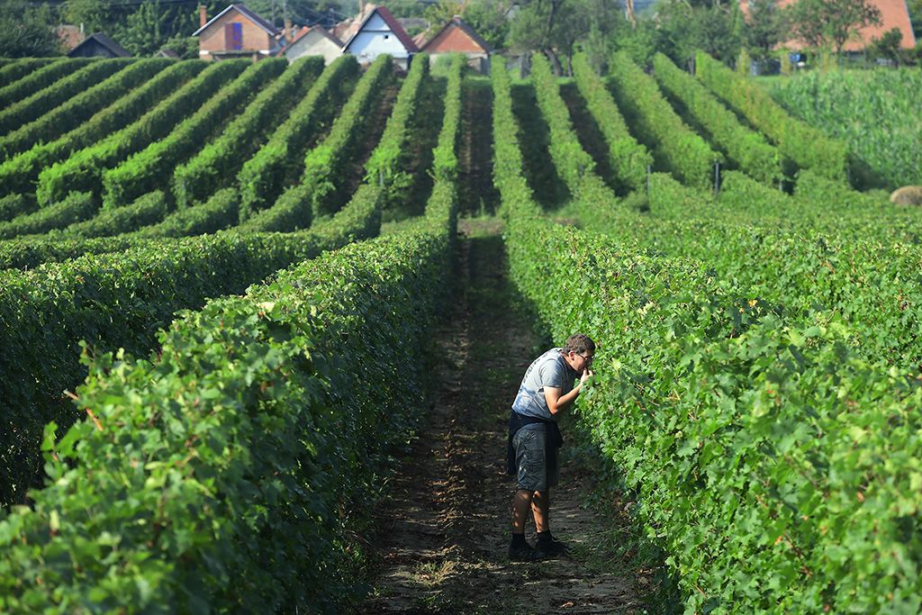 Lukácsy Zoltán borász szőlőt kóstol a monori Lukácsy pincészet szőlőültetvényén (MTI-fotó: Kovács Tamás)