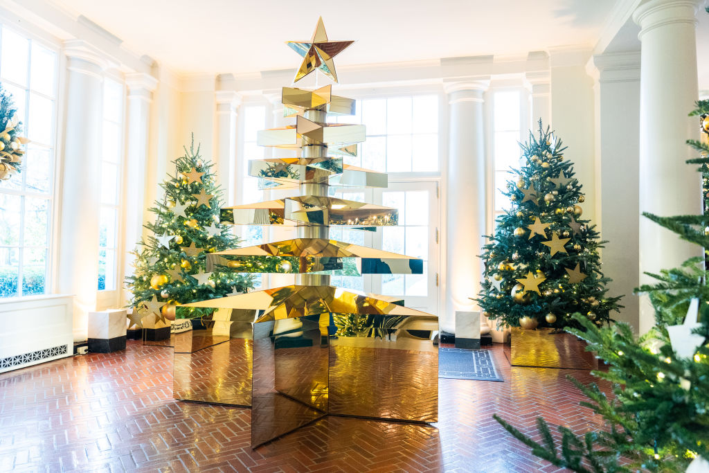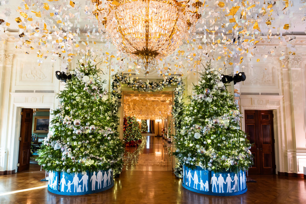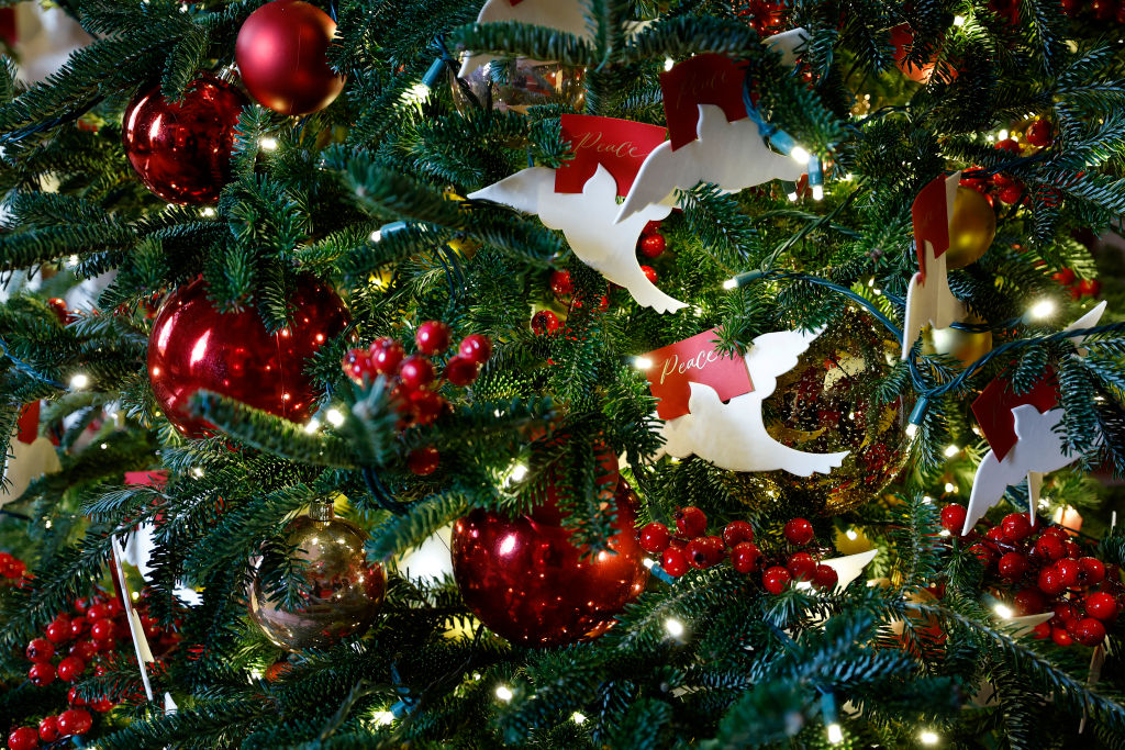 Karácsonyi díszbe öltöztették a Fehér Házat. Az idei ünnepi dekoráció témája – a first lady bejelentése szerint – a „béke és a fény évszaka”, amely az ünnepi időszak szellemét idézi a több ezer csillogó fénnyel és lebegő papírgalambokkal.