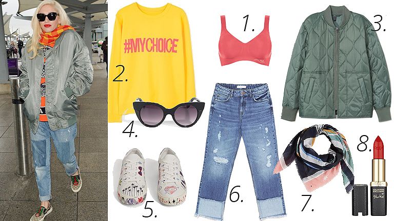 1. Varrás nélküli ZERO FEEL melltartó – sloggi / 2. Sárga, feliratos pulóver – Mango / 3. Steppelt dzseki – H&M / 4. Napszemüveg – Parfois / 5. Rajzos sportcipő – Mango / 6. Koptatott, kontrasztos paneles farmer – Zara / 7. Mintás sál – Tom Tailor / 8. Vörös rúzs – L’Oreal Color Riche