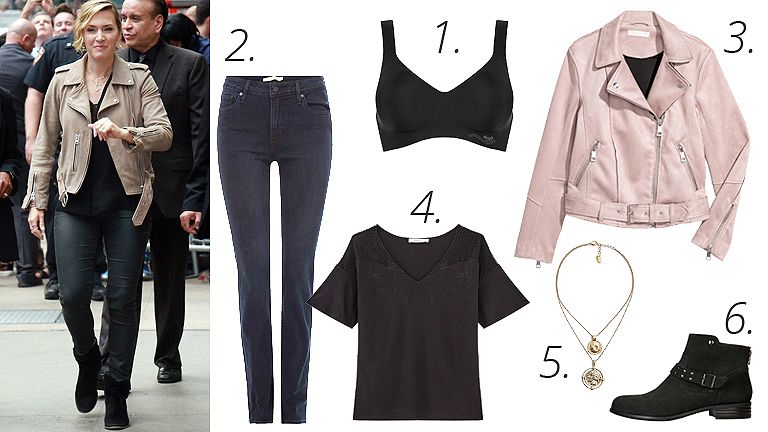 1. Varrás nélküli ZERO FEEL melltartó – sloggi / 2. Slim farmer – Levi’s / 3. Műbőr motoros dzseki – H&M / 4. Fekete, mintás felső – Promod / 5. Aranyfényű dupla nyaklánc – Mango / 6. Díszcsatos bokacipő – CCC