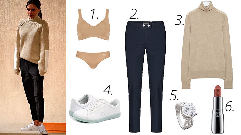 1. Varrás nélküli ZERO FEEL melltartó és bugyi – sloggi / 2. Élére vasalt nadrág – Orsay / 3. Garbónyakú, merinói gyapjú pulóver – COS / 4. Fehér sportcipő – Lacoste / 5. Köves gyűrű – Bijou Brigitte / 6. Colour up! shine on! ajakrúzs – essence