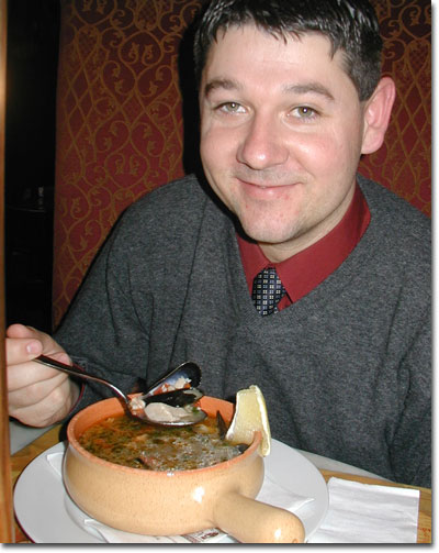 azon az estén tengeri hallevessel nyitott. Libamájszeletek sült hagymakarikákkal volt a roti.