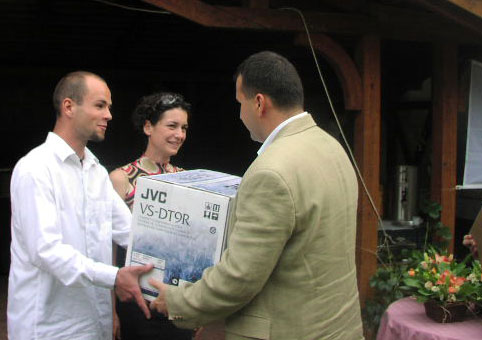 | Kádas Gergely átadja a JVC ajándékát |