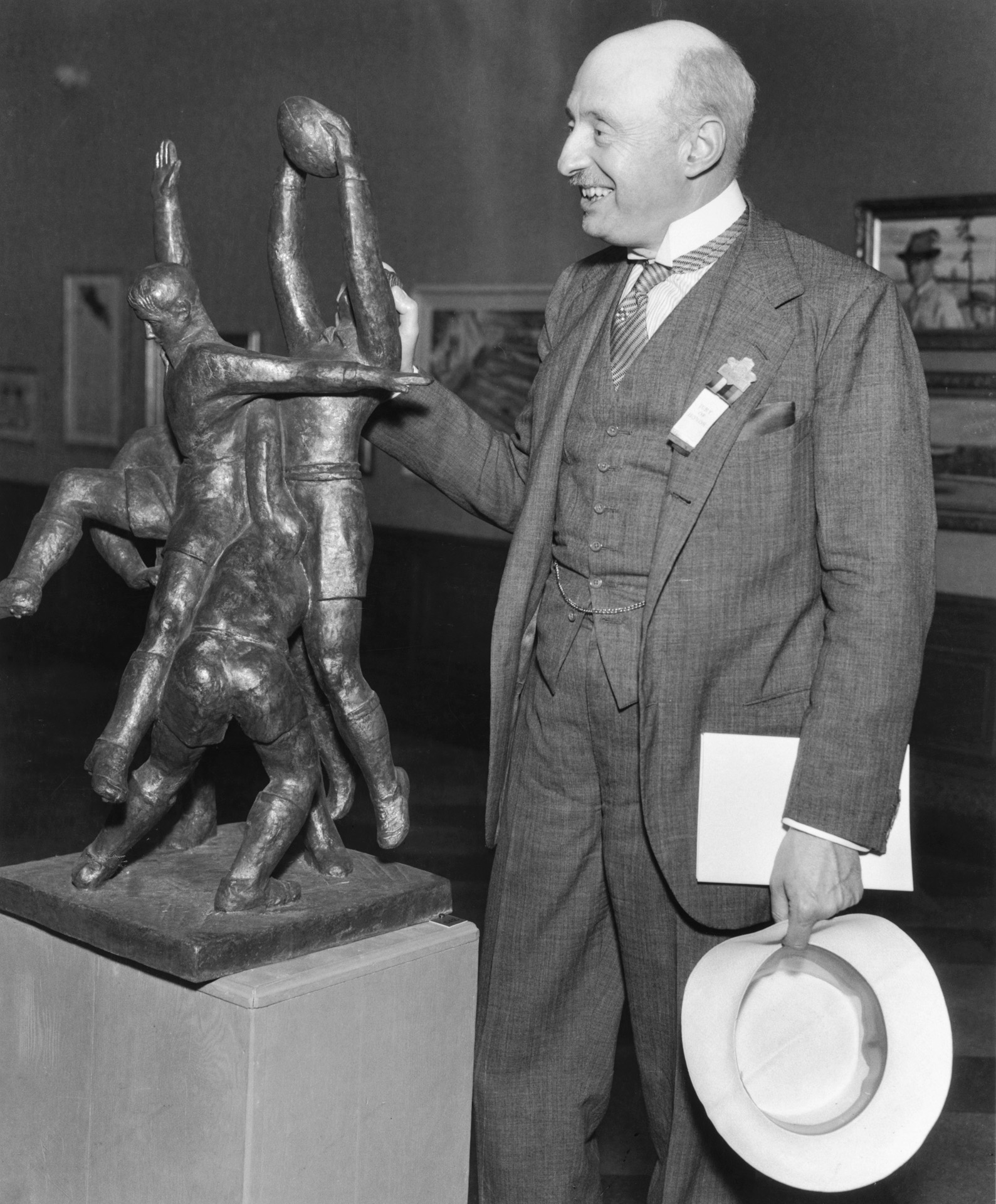 A Nemzetközi Olimpiai Bizottság elnöke megtekinti az egyik domborművet a Los Angeles-i Múzeum Olimpiai Művészeti Kiállításán, 1932. július 31-én (Fotó: UPI/Bettmann Archívum/Getty Images)