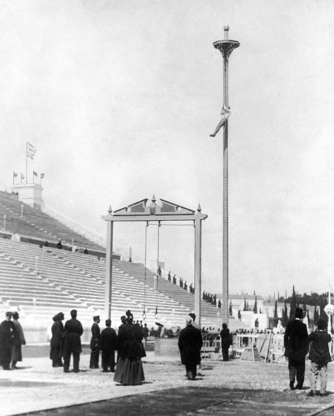 Nikolaos Andriakopoulos görög atléta az aranyérem felé vezető úton a kötélmászók számában az első modern nyári olimpiai játékokon, amelyeket az athéni Panathinaiko Stadionban rendeztek meg, 1896-ban (Fotó: Profimedia)