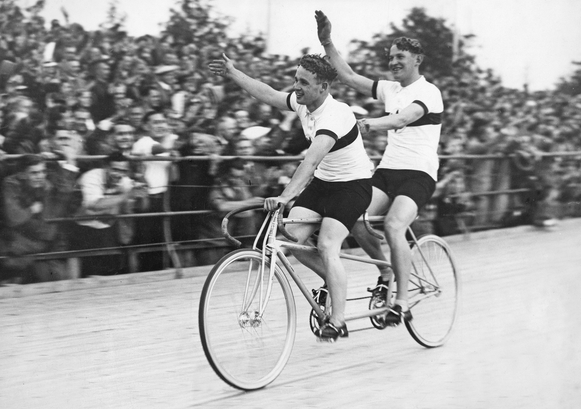 Tandem kerékpár: Ernst Ihbe és Charly Lorenz győztes német páros a célban integet, a 1936-os berlini olimpián (Fotó: ullstein bild/ullstein bild, Getty Images)