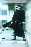 Neo tetőtől talpig fekete öltözékét így koppinthatjuk le: szerezzünk be (katonai ruházati boltból) egy nagy oldalzsebes katonai gyakorló nadrágot. Ezt szereljük fel bőrövekkel: kettő kerüljön a derékra, egy-egy a combokra és kettő – nadrágtartó-szerűen – a felsőtestre. Persze gondoskodjunk a fegyvernek látszó tárgyakról is! Egyszerű, kerek nyakkivágású felsőrészt és hosszú szárú, több csatos bőrcsizmát vegyünk fel. Az öltözéket hosszú, felhajtott gallérú szövetkabáttal társítsuk. Érkezéskor az arc ívét követő, keskeny, sötét napszemüveget viseljünk.