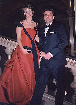 Szulák Andrea barátnőjével érkezett a bálba. A nőiesen telt alakú hölgyek számára jó példa lehet Andrea ruhaválasztása. A sötét alapszínű, de csillogó felületű, kerek dekoltázsú estélyi hosszú kesztyűvel nagyon elegáns.