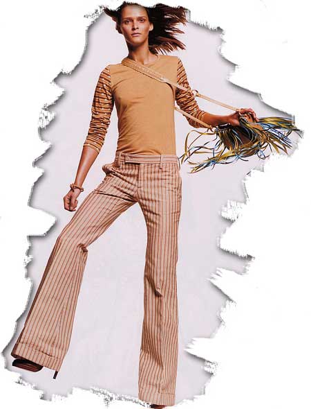 Az új csőnadrágok többsége csípőfazonú és sztreccsvászonból, illetve elasztikus farmerből készül. A modellek közt sok a függőleges csíkos mintájú, például fekete-fehér, barna-fehér vagy élénk színösszeállítású. A keskenyebb, illetve szélesebb, hosszanti csíkozás hosszítja a lábat!