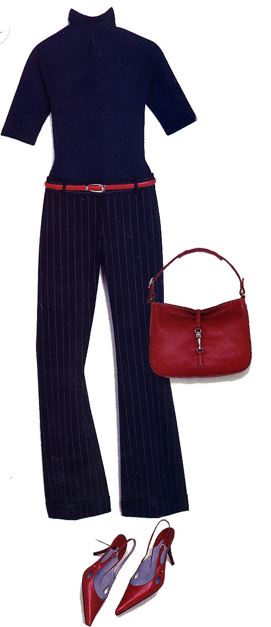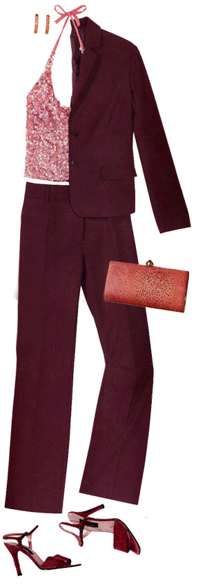 Az egy egyszínű, például fekete, sötétkék szövet nadrágkosztüm rövid ujjú mohergarbóval vagy ujjatlan toppal társítható.