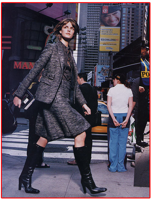 A teljesen alakra simuló, elasztikus szövetből varrt nadrágokat hosszú szárú, magas sarkú csizmával ajánlják.