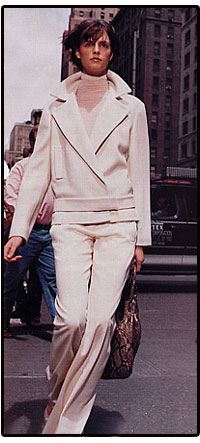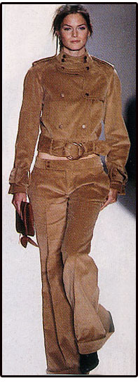 A lágy esésű anyagok igen nőiessé teszik e pantallókat. A trapéznadrág rövid, derék alatt végződő kabátkával divatos.