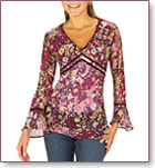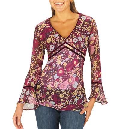 A virágos tunika mellrészét hangsúlyozza a ferdén lefelé futó dupla díszítőcsík. A szabásvonal, a minta, a tölcsérujj és a laza szövésű, áttetsző anyag a hippistílust hivatott idézni, persze lepuhított változatban.