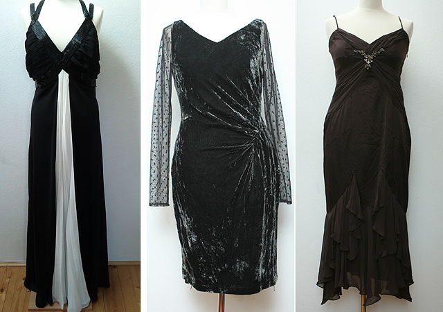 Bár igyekeztünk nem csak sötét színű ruhákat összeválogatni, azért a fekete a leginkább jellemző erre a műfajra. Már ennek a csokoládészínű Karen Millen selyemruhának is erősen örültünk, hogy végre valami kicsit más. Látványos alsó fodrai akkor mutatnak igazán jól, ha kifejezetten magas nő viseli a ruhát, fontos, hová esik a bővülés. A mellrészen látható strassz díszítés saját nyakék esetén könnyedén lecsatolható. Eredeti ára százezer forint körül.