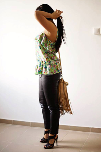 A nyár a fesztiválok időszaka, úgyhogy összeraktunk egy szupermenő rocker outfitet is. A nadrág ugyan csak műbőr, de igen jó minőségű, a blúz pedig tökéletesen hozza a népszerű őrült virágmintás trendet. A rojtos táskával pedig már a végletekig toltuk a hippisikket. Kicsit csaltunk, mert persze fesztiválra nem érdemes magassarkúban menni, de így mutatott a legjobban.