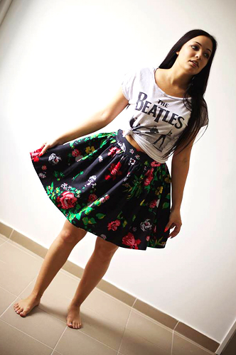 Persze a fotóprint lehet egészen hétköznapi viselet is, csak attól függ, mivel viseljük. Ezt a Beatles pólót is azonnal megkedveltük és szerintünk tökéletes és bájos párost alkot ezzel a virágos szoknyával. Nyilván nem feltétlenül munkahelyre való, de hétvége is szokott lenni, még ha nem is elég gyakran.