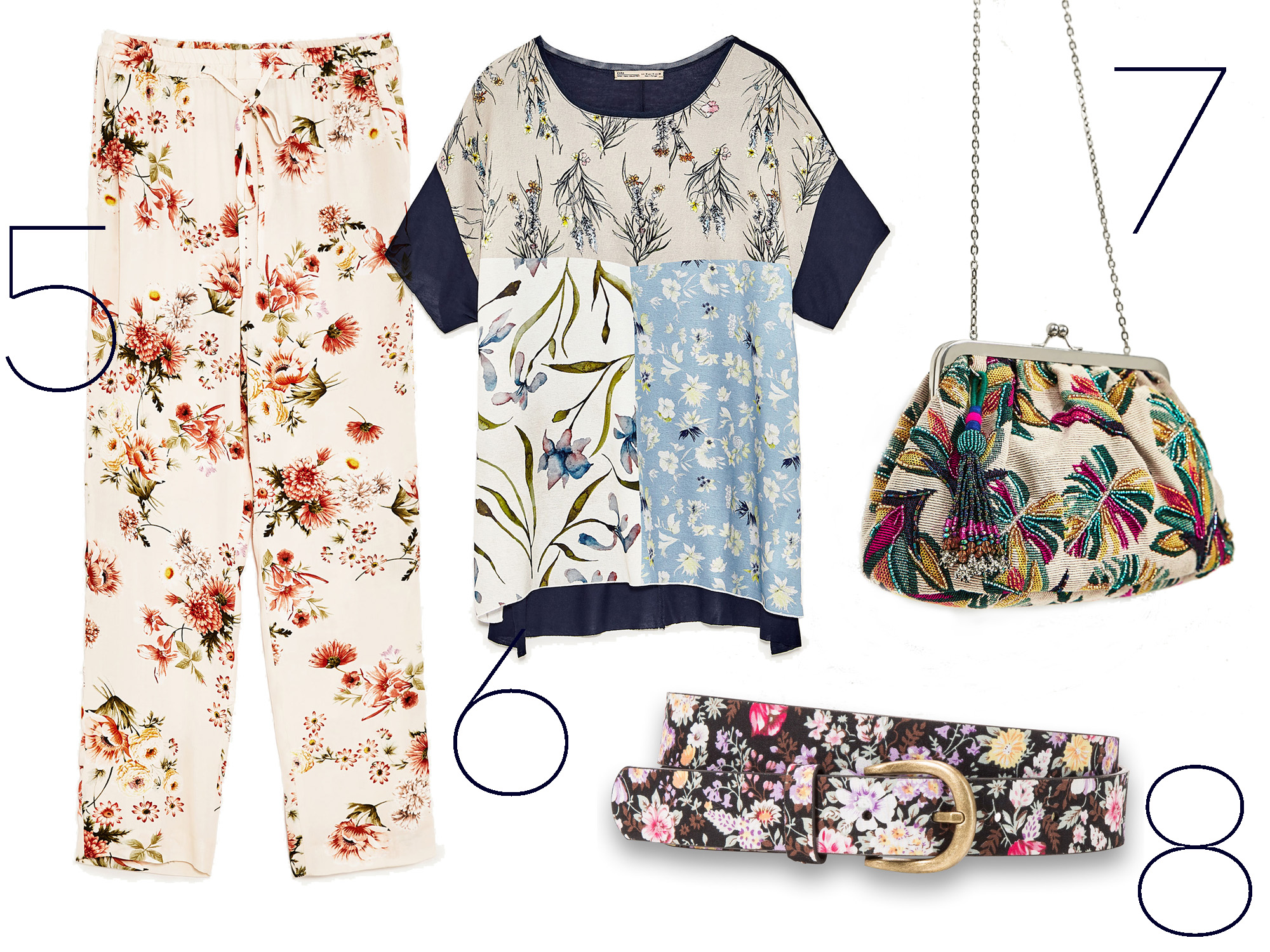 5. Finom színekből, száraz virágokra emlékeztető csokrokból álló mintákkal díszített lenge, nyári nadrág – Zara