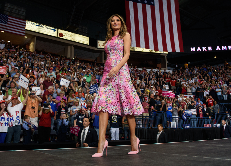 Melania Trump általában letisztult vonalú, egyszínű ruhákban jelenik meg a nyilvánosság előtt, mintás ruhát ritkán visel. E ritka alkalmak egyike volt a minap, amikor az ohiói Youngstownba kísérte el narancssárga férjét.