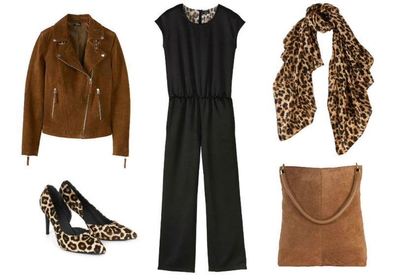 A sima, fekete overall sokoldalú darab, rengeteg különféle színű és stílusú ruhadarabbal és kiegészítővel kombinálhatjuk. A leopárdmintás sállal és tűsarkúval megállja a helyét például egy vacsorán, randin, de színházba vagy akár bulizni is elmehetünk benne. A világosbarna, velúrbőr dzseki és táska árnyalatában harmonizál a leopárdmintával, míg a feketével elegáns kontrasztot ad.