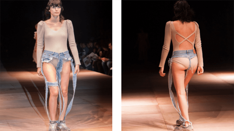 Persze nem úgy van az, hogy a kifutókon felvonuló őrült kreációk egy az egyben átkerülnek a fast fashion butikokba, de ezt a tangafarmert még visszafogott verzióban sem tudnánk elképzelni. A kreáció egy japán tervező, Thibaut agyszüleménye, és nemrégiben debütált a tokiói Amazon Fashion Weeken. De minek?