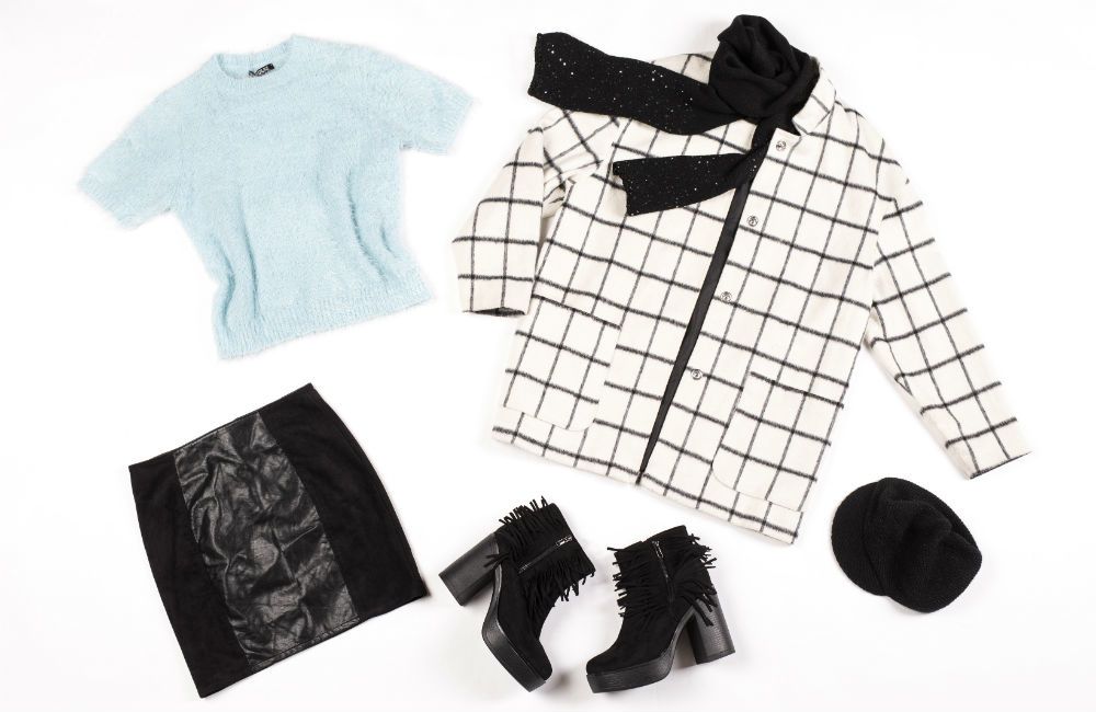 A fekete-fehér összeállításokat nem csak élénk, de akár pasztell árnyalatokkal is feldobhatjuk, például ezzel a babakék, rövidujjú pulóverrel, melynek bolyhaival stílusosan kacsintanak össze a bokacsizma rojtjai. Az eltérő textúrájú elemekből álló szoknya előnyös azoknak, akik szeretnék, ha keskenyebbnek tűnne a csípőjük, hiszen a matt felületek optikailag keskenyítenek, míg a fényes rész kiemel és hosszít. Tovább fokozhatjuk ezt a hatást, ha egy vastagabb, fekete harisnyát húzunk hozzá.