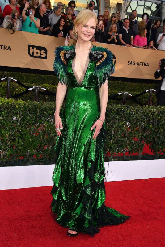 Nicole Kidman év eleji, stílusbeli ámokfutásának egyik legfélelmetesebb szettje volt ez a papagájos Gucci, melyet az SAG-gálán viselt.