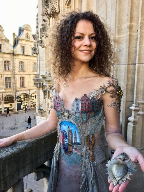 Így készített csodás estélyi ruhát könyvgerincekből, vagy éppen egy hegedűből. De a festésben is szívesen kibontakozik, egy káprázatos báli ruhán például egy óvárosi látképet festett a csipke berakások közé. Álmodni sem tudnánk szebbet!