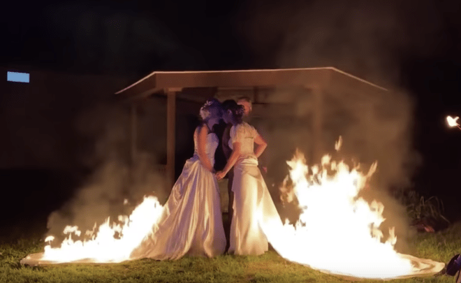 A 32 éves April Choi és a 28 éves Bethany Byrnes október 13-án házasodtak össze. A két varietéművész, akik tűzzsonglőri számokkal is fellépnek, a foglalkozásukhoz passzoló attrakcióval szórakoztatták a násznépet. A ceremónia után ugyanis felgyújtották a menyasszonyi ruháikat, mégpedig úgy, hogy az még rajtuk volt.