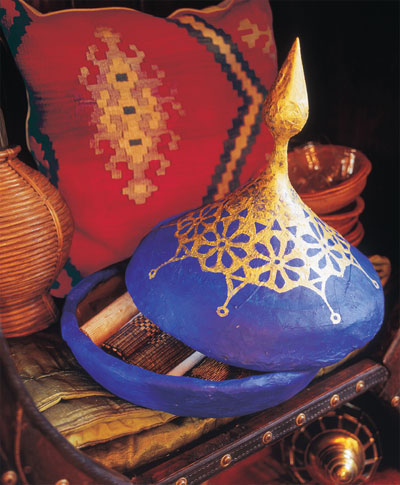 Pompás paloták, mesés karavánszerájok és mecsetek formavilága ihlette ezt a papírmaséból készült fedeles tálat, amelybe féltett kincseinket rejthetjük.