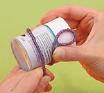 Első lépésként a drót egyik végét hajlítsuk vissza, majd körülbelül 20-25 cm hosszan fűzzünk fel rá nagy szemű kásagyöngyöt, és a drótot, mint a kezdéskor, egy kis hurokkal zárjuk le. Mindkét végére hajlítsunk egy-egy nagyobb hurkot díszítésnek, és végül egy megfelelő átmérőjű hengeres tárgy (pl. festékes- vagy gyógyszeres üveg) segítségével hajlítsuk formára. Összetekert textilszalvétára húzva mutat igazán.