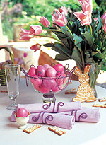 Finoman elegáns és harmonikus lesz az ünnepre terített asztal, ha a sokféle szín helyett egyetlen hozzánk közel állót választunk, és ennek különböző árnyalatait használjuk a díszítéskor. Mi a különleges mályvaszínű tulipánokhoz hangoltuk a terítőt, a szalvétákat,