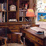 4. Bár a számítógép a modern kor találmánya, de azért a klasszikus enteriőrök kedvelőinek otthonába is beilleszthető. Ezt bizonyítja ez a sötétre pácolt, tiszta fából készült íróasztalra telepített home-office, amelyet szép, gazdagon faragott könyvespolc egészít ki. Hagyományos angol stílusban tartva, rózsamintás függönnyel, perzsaszőnyeggel kiegészítve nagyon elegáns és barátságos látvány. (Practic Romantic