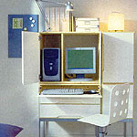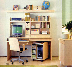 7. Nem kell feltétlenül új bútorokat venni vagy csináltatni, ha számítógép asztalra van szükségünk, különösen akkor nem, ha a többi berendezési tárgyunk is régi. Ha szereted az antik fenyőbútorokat és van egy szép író-, vagy fésülködőasztalod, egy kis ravaszsággal könnyedén monernizálhatod. Ezúttal a középső, szélesebb fiókra fedlap készült a klaviatúra számára, amikor a gépet nem használják, a rátét levehető és az asztal alján lévő sínbe csúsztatható, és a fiókot máris betolhatjuk a benne lévő billentyűzettel együtt. Ugyanilyen szisztéma szerint működik a jobboldali kisfiók is, amelyen az egér tartható. (Egyedi darab, hasonló stílusú bútorokat a Kéttemplom Galériában, Bp. Gyulai Pál u. 10. Találhatunk.)