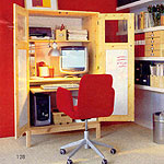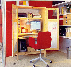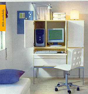 9. Fenyőből készült ez a ruhásszekrény méretű dolgozókuckó. A bútor belsejében nemcsak a számítógép fér el, de kényelmesen tárolhatunk benne iratokat, apróbb tárgyakat is, sőt megfelelő világítással is felszerelhetjük. Ráadásul az ajtószárnyak belső felét emlékeztető táblaként is használhatjuk, felső, üvegezett ablakától pedig könnyedebb, szellősebb az összhatás. (Ikea)