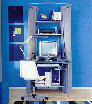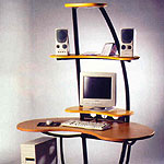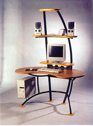 1. Modern és igazán egyedi, mindenesetre formabontó megoldásokkal bír ez a négyemeletes komputer-állvány. Ívesen hajlított, feketére festett csővázán cseresznyeszínű, vese alakú asztallap, illetve polcok állnak, maga a gép szinte lebeg rajta. Olyanok válasszák ezt a lendületes, fiatalos, kicsit bohém darabot, akik szeretik az extravaganciát, munkájuk közben nem kell sok papírt, forrásmunkát használniuk (csak így, csupaszon mutat jól az asztal), és akik különben is hajlamosak az eredetiségre. (K.I.D. Irodabútor Stúdió, Bp. Hungária krt 102. 251-2887)