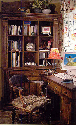 4. Bár a számítógép a modern kor találmánya, de azért a klasszikus enteriőrök kedvelőinek otthonába is beilleszthető. Ezt bizonyítja ez a sötétre pácolt, tiszta fából készült íróasztalra telepített home-office, amelyet szép, gazdagon faragott könyvespolc egészít ki. Hagyományos angol stílusban tartva, rózsamintás függönnyel, perzsaszőnyeggel kiegészítve nagyon elegáns és barátságos látvány. (Practic Romantic