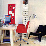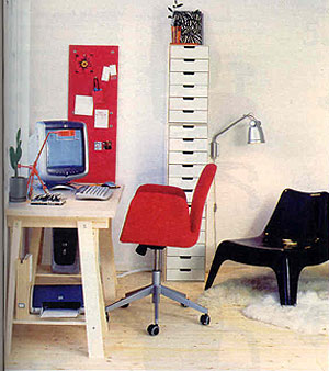 5. Fiatalok, első otthonosok, albérletben lakók választása lehet ez az igazán laza összeállítás, amely tulajdonképpen néhány olcsó, de praktikus darabból áll. Az egyszerű, barkács munkapadra, vagy rajzasztalra is emlékeztető nyers, natúr asztalhoz vad, piros forgószéket és papírból gyártott, fiókos tároló dobozokat társítottak. (Ikea)