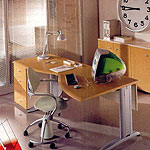 6. Egyszerre modern és elegáns ez a matt króm lábakkal felszerelt, bükk asztallapos dolgozó, hozzá fiókos elem, és irattárolásra is alkalmas alacsony szekrények tartoznak. Szépségét az érdekes alakú, hullámíves asztalnak köszönheti, de igazán nyerő az óriási, pályaudvarra illő órától lett. (Vivax Győr, Közép u. 16. 96/418-180)