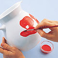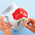 A porzókat fekete színnel fessük ki. Ahol mélyebb piros színárnyalatot szeretnénk, fessük át hígított fekete festékkel, így válik igazán térhatásúvá. Ugyanígy fessük fel a bimbókat a tálra is! A festék fajtájának megfelelően hagyjuk azt megszáradni, vagy tegyük sütőbe 160-180 fokra, és égessük a festéket a kancsóra.
